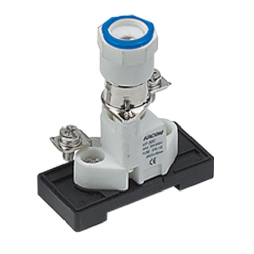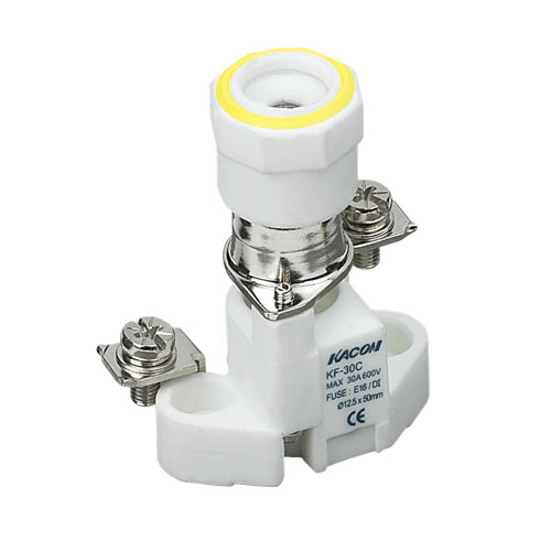 KF-30C熔断器底座壳体使用电工高频陶瓷烧结制成,具有绝缘强度高、寿命长、耐高低温的优良特性。其接线端子部与熔断体接触部使用整体的电工黄铜材料拉伸制成,一体化构造,通电率高、温升低,显著增加可靠性和机械强度。 螺旋锁紧手柄部带有用于电路功能标示的色环,默认配置黄色,另附带红、蓝色环,使用者可以根据需要灵活更换,例如应用在三相电路ABC相位标志或者控制电路中的不同功能标志,同时还具有熔断体状态观察窗。 带防护罩KF-30CL型除具备上述功能外还配置有熔断体状态LED指示灯和用于电路编码打印用的标志窗。 KF-30C简易型可以表面螺丝安装也可以增设KF-30CL-B导轨安装底板后进行导轨安装,在安装熔断体之前盖上KF-30CL-C防护罩即达到KF-30CL的全部功能。 应用于额定600V以下电动机负载、变压器负载、加热器负载、照明负载、各种控制电路、普通负载的过流短路保护,以及应用于电源与负载的隔离保护。 |